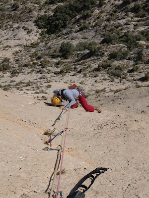 En concreto en el penúltimo largo en la zona de septimo grado antes de llegar al primer parabolt hay un aleje que no sé como resolverlo. Tras un intento en libre que no veo claro que me salga, opto de nuevo por el plan B. Busco cualquier agujero que permita meter algo y... claro ahí está. Pero no llevo fisureros y los aliens que llevo no entran. Saco la uña salvadora y queda bastante bien, le meto el estribo, saco la tramposa y voalá llego al parabolt.