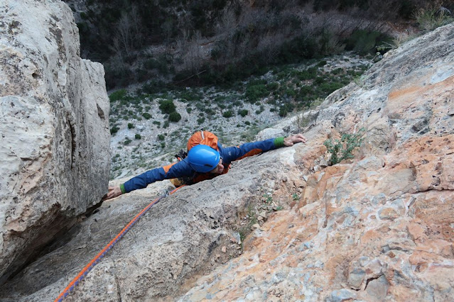 Rappelamos la vía por una línea justo a su derecha, que corresponde a otra vía más moderna y aparentemente más sencilla. Cumplido el objetivo de escalar al sol, calentar y calentarse, por un rato dudamos. Los días son cortos, y ya la sombra con su caída de temperaturas se ha adueñado de los primeros 40 m de pared. Hoy conduciremos hasta Alicante, y molaría cenar con luz.